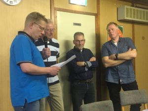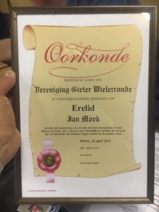 Tijdens een druk bezochte Algemene Ledenvergadering van de Vereniging Gieter Wielerronde zijn maar liefst 4 ereleden benoemd. De zittende bestuursleden Jan Moek en Jan Hagel waren tijdens de vergadering vanwege gezondheidsreden aftredend en niet herkiesbaar. Zij werden voorgedragen als erelid van de vereniging, dit vanwege hun grote verdienste tijdens hun bestuursperiode maar ook voor de jarenlange inzet als vrijwilliger. Herman Strijbosch was vorig jaar afgetreden als bestuurslid en werd nu ook als nog tot erelid benoemd, dit ook vanwege zijn inzet voor de vereniging. Alle drie zijn en blijven overigens nog vrijwilliger bij de club. Als vierde werd Geert Lutjes voorgedragen. Geert is sinds 1963 als vrijwilliger betrokken bij het wielergebeuren in Gieten en heeft te kennen gegeven vanwege zijn leeftijd om er nu een streep onder te zetten. 55 jaar vrijwilliger bij dezelfde organisatie, hetgeen niet velen geschonken is en derhalve werd ook hij benoemd tot erelid. Vice-voorzitter Wim Veenhof mocht de oorkondes aan 3 ereleden overhandigen, Herman Strijbosch kon vanwege omstandigheden helaas niet aanwezig zijn.